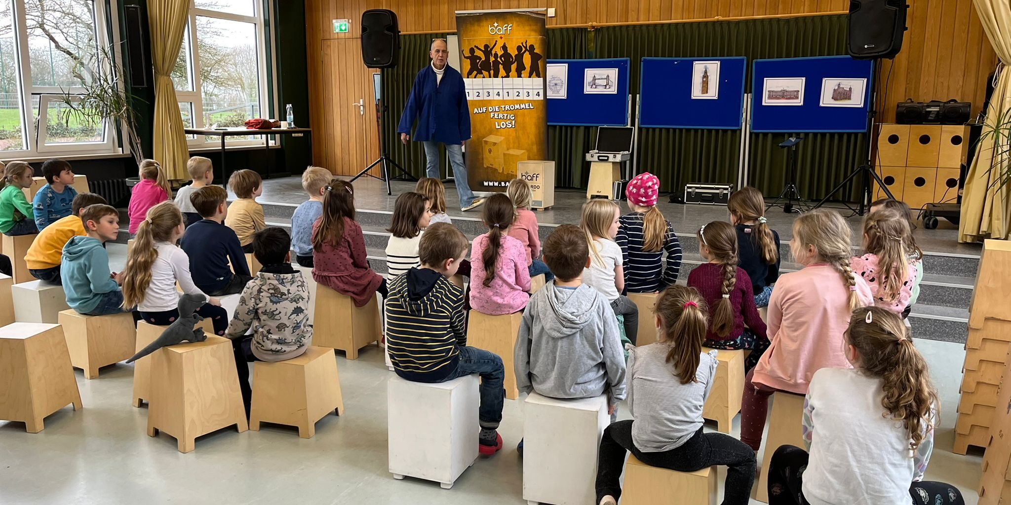 Einen ganz besonderen Schultag hatten unsere Schüler und Schülerinnen durch den Trommelworkshop. Da für jedes Kind ein eigenes Cajón zur Verfügung stand, durften anfangs alle gemeinsam die Aula mit Tönen füllen. Anschließend wurde klassenweise ein Lied erarbeitet, dass jede Klasse als Abschluss auf der Bühne stolz präsentiert hat.