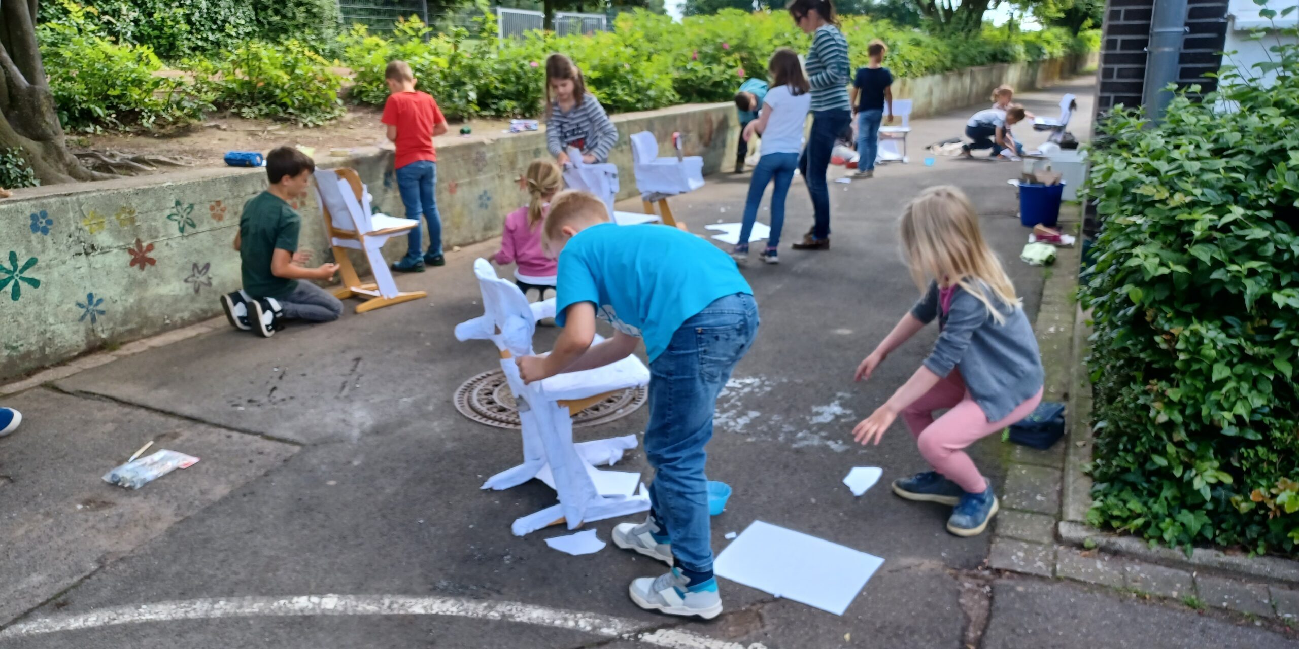 In unserer dreitägigen Projektwoche zum Thema Kunst beschäftigen sich alle Schüler und Schülerinnen mit der Arbeit einzelner Künstler oder der Verschönerung der Schule und des Schulhofs. Ein Fokus liegt dabei auf der praktischen Arbeit, egal ob mit Farben, Holz, Wolle oder anderen Materialien. Um dies stattfinden zu lassen, hat uns der Förderverein mit einer großen Geldsumme unterstützt, doch auch Farben Fischer und Baumarkt Voß helfen finanziell und mit Sachspenden. Die Kinder sind motiviert dabei und schaffen sicherlich tolle Kunstwerke.